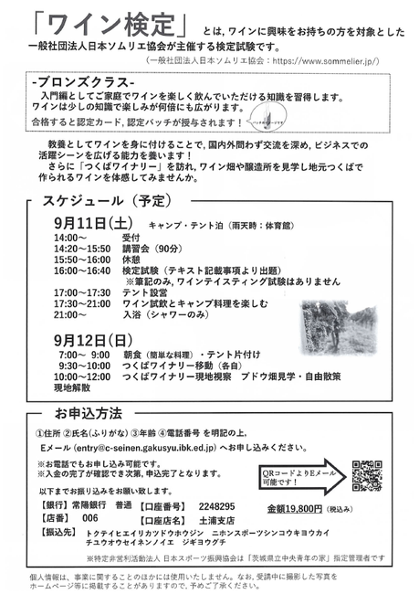 2021/7/16 【 茨城県立中央青年の家 】ワイン検定講座のお知らせ【 テント泊あり 】