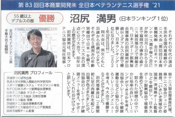 2022/1/29 【茨城新聞掲載!】全日本ベテランテニス選手権大会優勝!日本ランキング1位になりました!!🏆