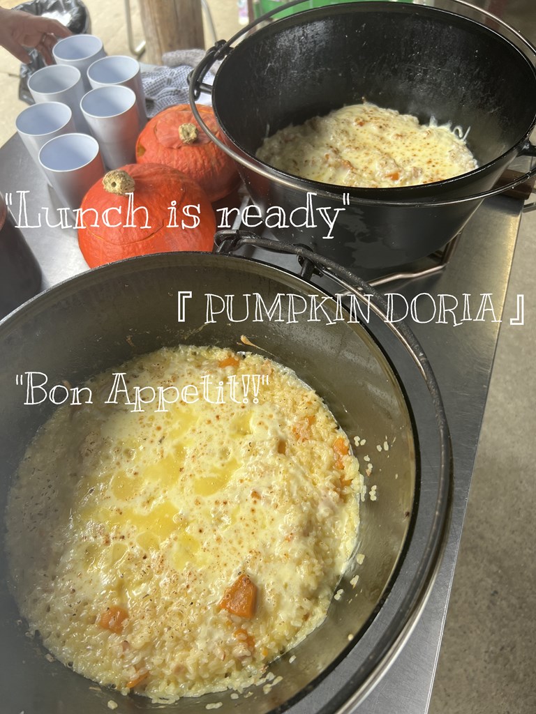2日目は、野外でダッジオーブンを使った「かぼちゃドリアづくり」をしました😊🎶